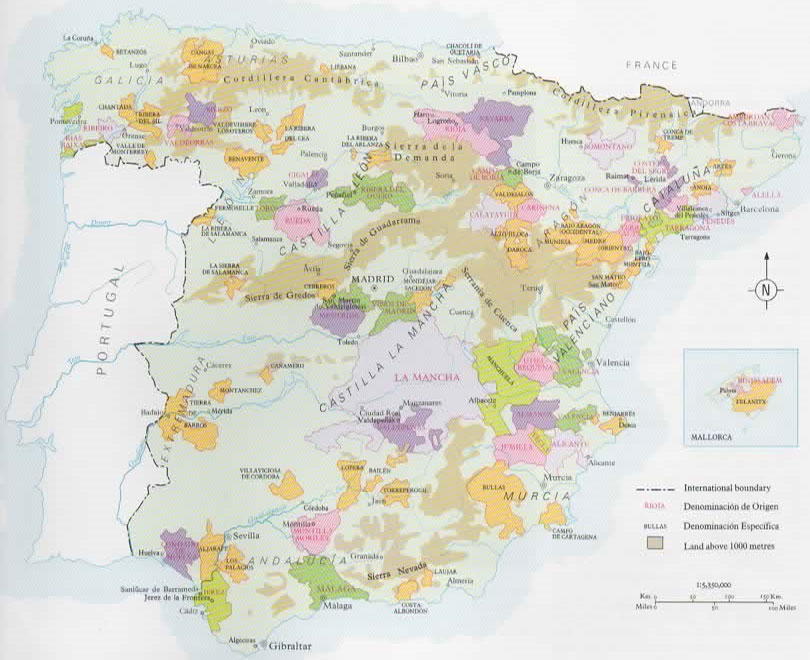 The map shows what a large part of the country is already demarcated either into full-fledged DOs (the nearest equivalent is Italy’s DOCs) or the apprentice category of DE (Denominación Especifica) where aspiring regions must wait for promotion. Already nearly half the nation’s total vineyard area, which approaches 1.5 million hectares of vines, is classed as DO, producing almost a third of Spain’s wine (a third of which is exported). The top rank, equivalent to Italy’s DOCG, is DOC (Denominación de Ongen Calificada). The first was granted in 1991 - very properly to Rioja.